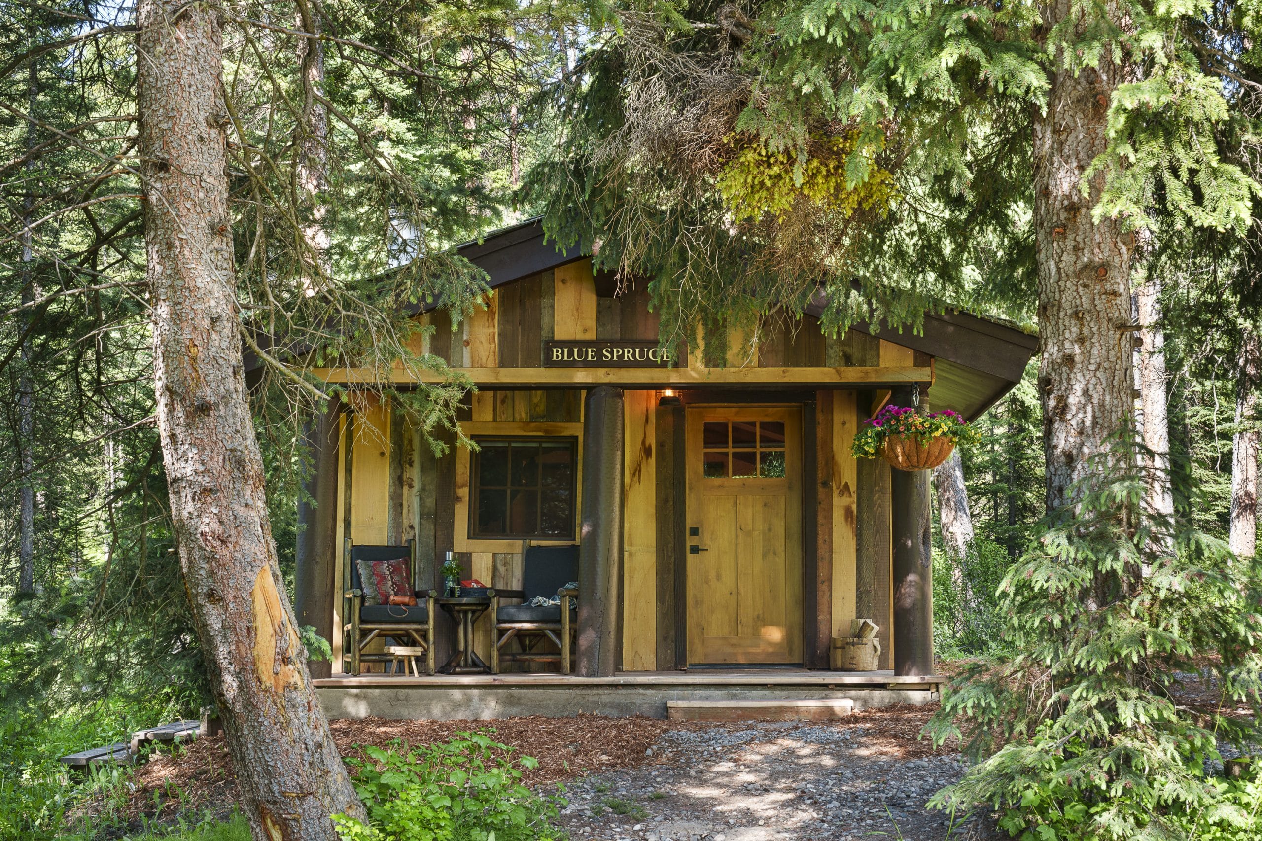 Named for the distinctive blue spruce, with its silvery-blue needles that shimmer in mountain light, this serene cabin offers peaceful forest views. One beautifully appointed room features a king bed, desk, woodstove, and full bath with soaking tub and spacious walk-in shower. The shaded front porch invites daytime relaxation, while just behind the cabin, a private creekside nook with chairs provides the perfect hideaway for meditation, reading, or losing yourself in the soothing sounds of North Fork Creek flowing below.