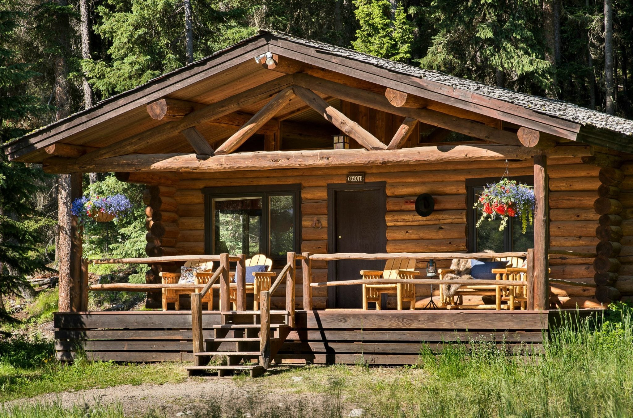 Taking its name from the coyote, a symbol of adaptability and frontier wit, this cabin blends frontier charm with relaxed mountain comfort. Its two bedrooms—each with a king bed and private bath—along with a spacious living room make it ideal for families or small groups, with a pull-out queen sofa sleeper available for added flexibility. One bedroom features a clawfoot soaking tub, walk-in shower, and its own fireplace—an inviting place to unwind after a day on the trails—while the second offers a full bath with a walk-in shower. The covered porch looks out toward the mountains and can comfortably host private gatherings of up to 12 people.